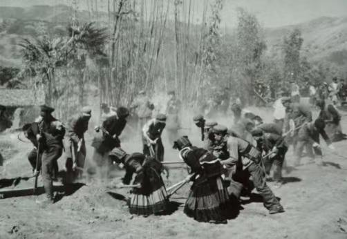 20世纪70年代,为支援西昌卫星发射中心建设,冕宁彝族群众支援专用公路建设(图片来源:中共冕宁县委宣传部)