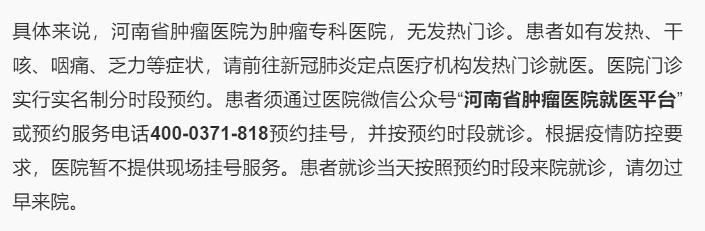 ◆11月15日,河南省肿瘤医院发布河南省肿瘤医院就医须知,疫情期间,医院将严格落实防控措施,为患者提供门诊、住院、检查、手术等诊疗服务,全力保障广大肿瘤患者就医需求。