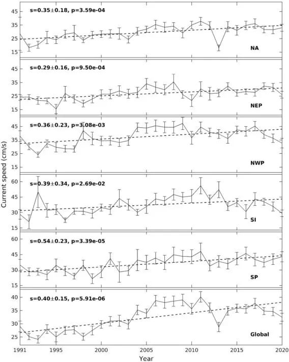 ▲原文图2.1991-2020年期间各洋盆及世界大洋中弱台风条件下海洋混合层流速的逐年变化特征(NA, NEP, NWP, SI, SP, Global分别指北大西洋,东北太平洋,西北太平洋,南印度洋,南太平洋,世界大洋)。