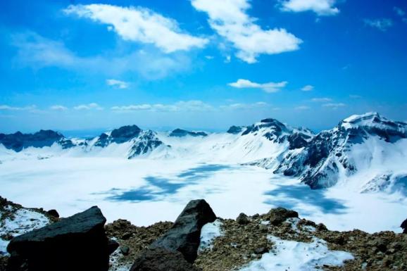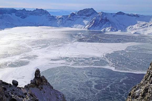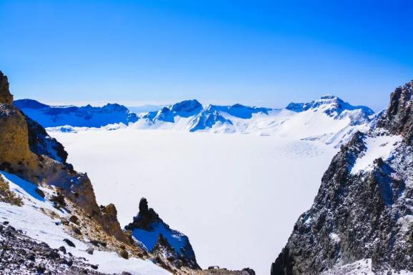 冬天,一定要来长白山看天池。冬日的天池被冻的已经结冰,湖面被皑皑白雪覆盖,湖边的火山岩若隐若现。冬日的暖阳在这里也成了奢侈品,一点也不暖和。