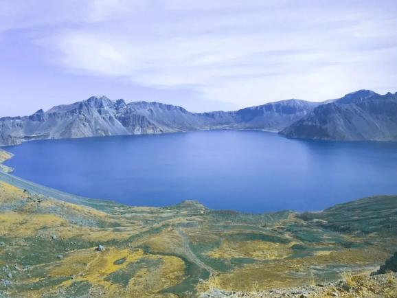 #天池长白山天池是一座休眠火山,火山口积水成湖,像一块瑰丽的碧玉镶嵌在雄伟的长白山群峰之中。夏融池水比天还要蓝;冬冻冰面雪一样的白。