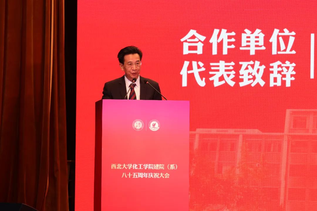 西安交通大学化学工程与技术学院院长杨贵东代表兄弟院校致辞,杨贵东对化工学院八十五周年院庆表示祝贺。他指出,化工学院与时代同呼吸、与民族共命运,坚持以贡献求发展、以创新求突破,积极响应国家号召,培养了一大批高素质创新型人才,为国家、西部特别是陕西发展作出了重要贡献,作为兄弟院校,西安交通大学化工学院也将一如既往对西北大学化工学院发展给予支持,期待化工学院在立德树人、学科建设等工作中取得新的更大的成绩。合作单位代表致辞