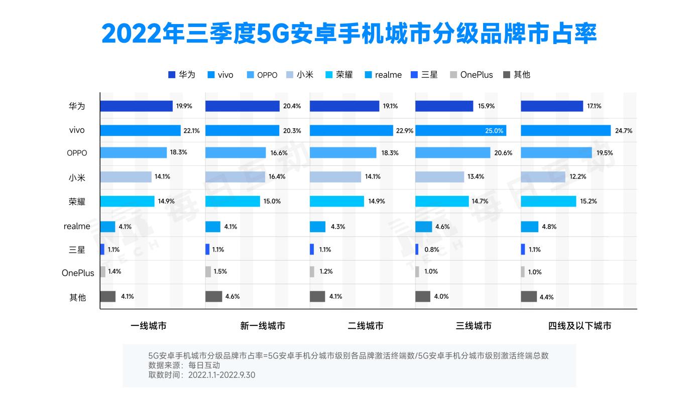 每日互动大数据显示,vivo在一线、二线、三线、四线及以下城市的品牌占比均处在领先位置;华为在一线、新一线、二线城市仍具备影响力;荣耀在各级别城市的品牌市占率均较二季度有明显增长。