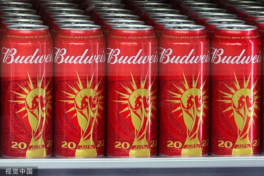 2022年11月18日,卡塔尔2022年世界杯足球赛之前,印有国际足联世界杯标志的百威啤酒罐在多哈展出。卡塔尔的酒类销售受到严格监管。视觉中国 图