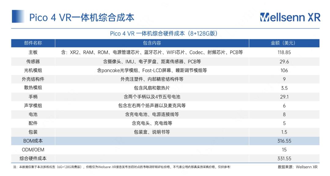 根据XR行业垂直研究机构维深信息拆解显示,Pico 4(8+128G)的硬件成本为331.55美元,约合2373元人民币,已经极度接近2499元的发售价。新浪科技此前援引业内人士的说法,如果算上PICO4定制的屏幕、被忽略的结构件成本、还有 PICO 4 大致70%的良率,PICO 4 每卖出一台设备,字节就得亏近3000块。
