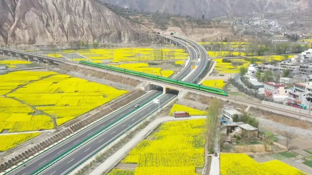 ▲兰渝铁路穿过油菜花田。李董 摄