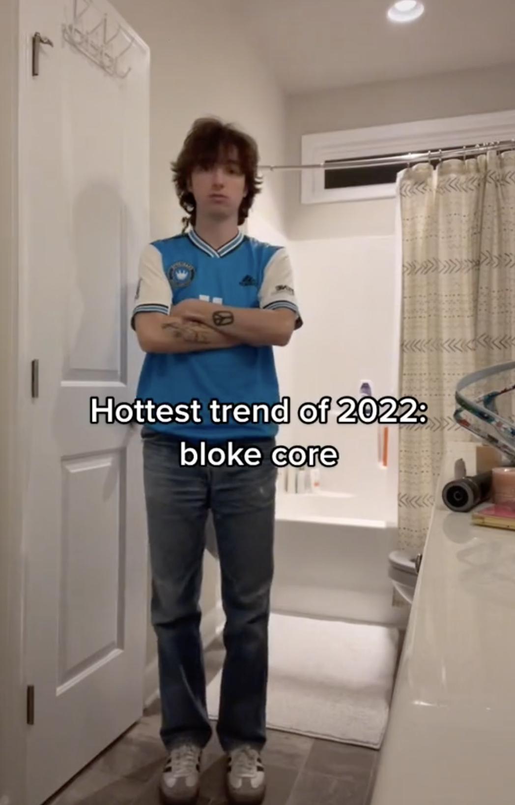 tiktok博主@brandonlhuntley,上身球衣配上一条水洗上百次的仔裤,加上一双踩成灰色的波鞋,tag上自创的“bloke core”。