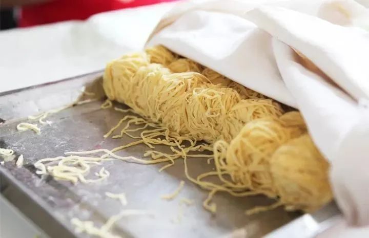与其它制面方式不同,杠子面和面时只用适量的面粉和鸡蛋,不用加水就直接和成面团,然后再用一套多达十三根的大小杠子进行擀面,最主要的工具就是一根大杠子,面团经杠子碾压、折叠一一碾压……如此反复,最后再把面皮切成细丝,杠子面条就这样完成了。