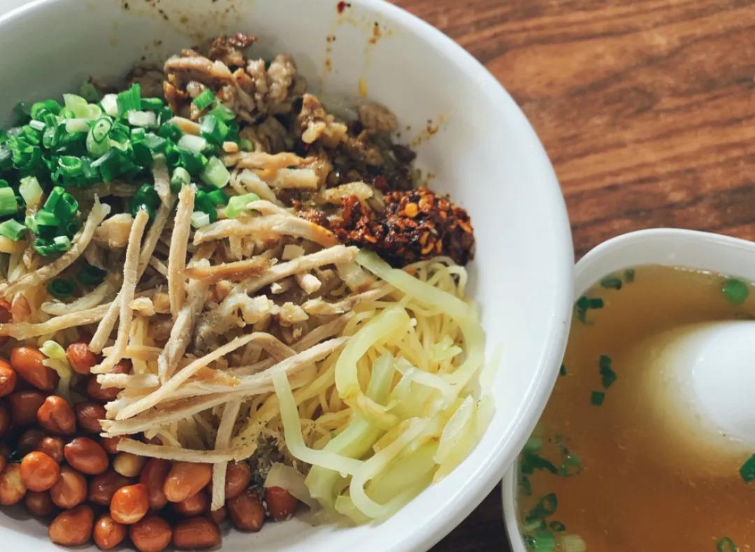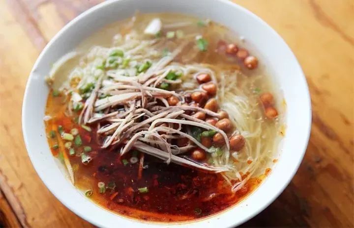 煮熟后的杠子面吃起来会伴着淡淡的鸡蛋清香,配上香浓鲜香的鸡汤做成的汤底,再加上一勺炸脆的花生、美味的脆哨、细腻的肉丝和清脆的豆芽或是榨菜,它独特的爽滑劲道的口感让人连连称赞!