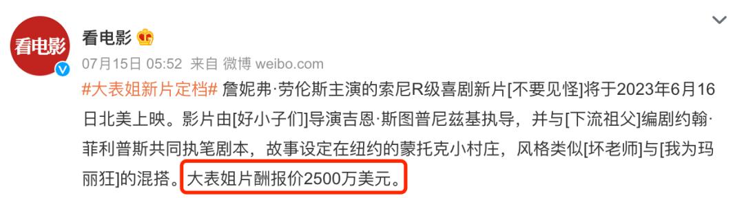 同时回到巅峰的,还有片酬。定档明年的新片《不要见怪》,片酬报价高达2500万美元(约合人民币1.78亿)。