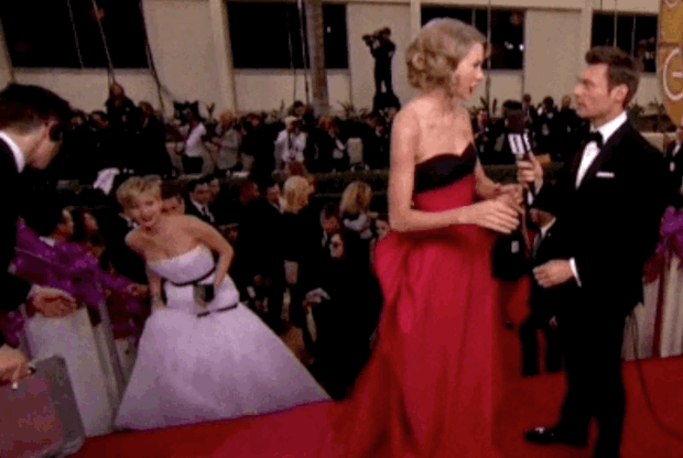 还有一次,金球奖上泰勒·斯威夫特在接受采访。结果最抢镜的是背景里她的表情包。