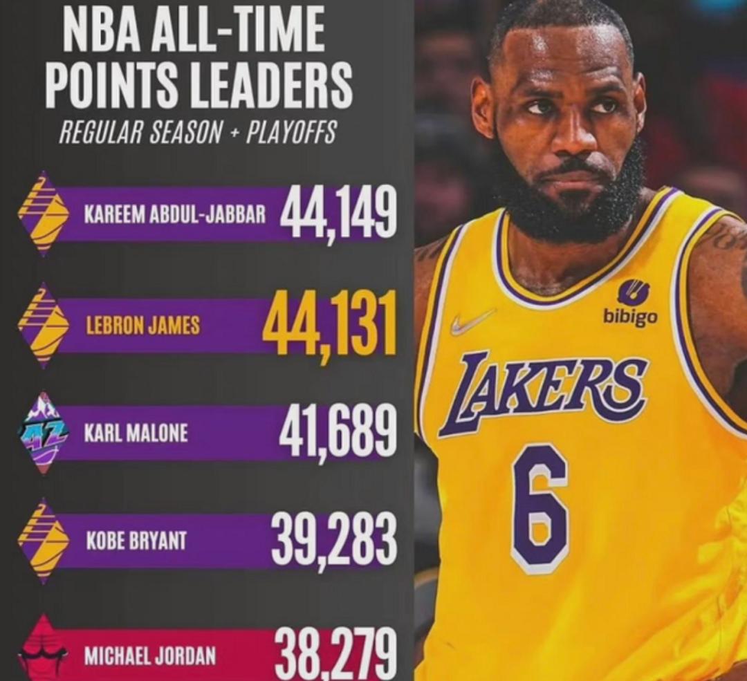 ◇ 湖人队时期的詹姆斯在常规赛和季后赛拿下44131分