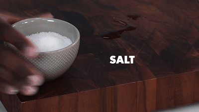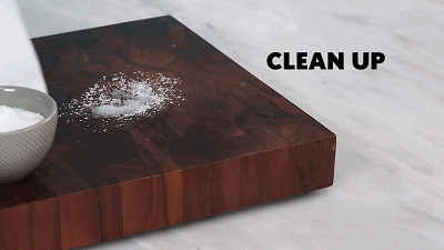 将食盐撒在菜板表面上后,用切好的柠檬均匀擦拭菜板,菜板就会洁净如新啦,省了一笔买新菜板的钱呢。
