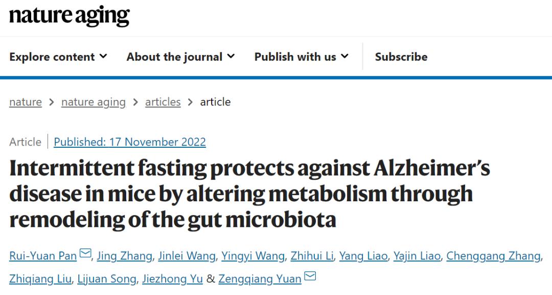 2022年11月17日,军事医学研究院袁增强、曹瑞源等人在 Nature 子刊 Nature Aging 发表了题为:Intermittent fasting protects against Alzheimer’s disease in mice by altering metabolism through remodeling of the gut microbiota 的研究论文。