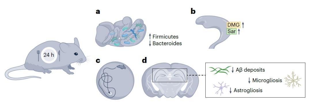 间歇性禁食会改变肠道菌群组成,使乳酸菌等益生菌显著富集。肠道菌群组成的变化影响了代谢活动和代谢物的产生。代谢组学分析显示,间歇性禁食导致碳水化合物代谢(例如葡萄糖)减少,肌氨酸(Sar)和二甲基甘氨酸(DMG)等氨基酸的含量增加。该研究还发现,间歇性禁食升高的肌氨酸或二甲基甘氨酸在阿尔茨海默病小鼠模型中模拟了间歇性禁食的保护作用,包括改善认知衰退、Aβ负担,以及神经胶质过度激活。