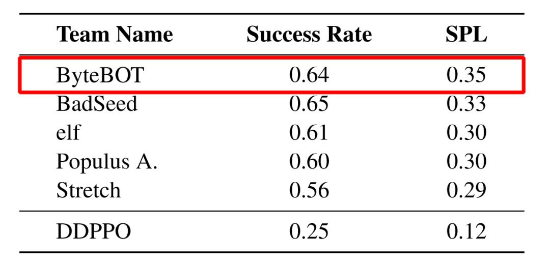 Habitat Challenge 挑战赛由 Meta AI 等机构联合举办,是物体目标导航领域的知名赛事之一,已连续举办4届, 此前夺冠队伍出自 CMU、UC Berkerly、Facebook 等知名机构。2022 年的最新一届比赛共有 54 支参赛队参加,字节跳动 AI Lab-Research 团队的研究者针对现有方法的不足,提出了一种全新的物体目标导航框架。该框架巧妙地将模仿学习与传统方法结合,在关键指标 SPL 中大幅度超过了其他参赛队伍的结果。