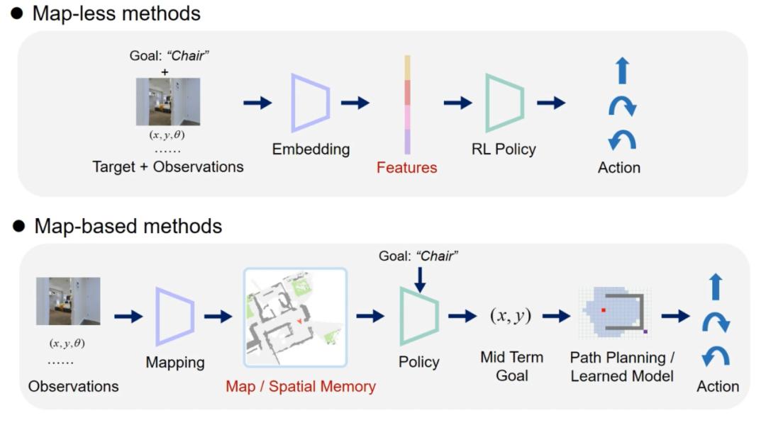 目前,物体目标导航方法可以大致分为两大类:端到端的方法;基于地图的方法。
