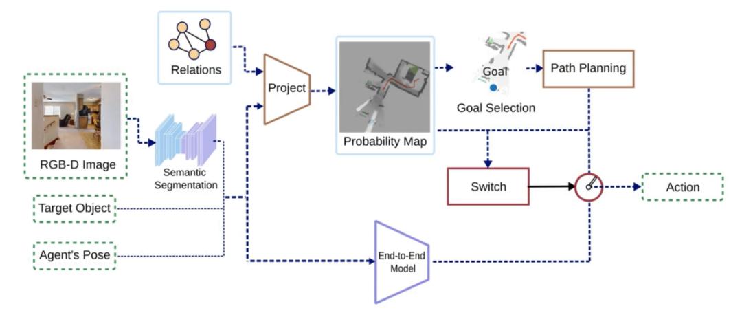 算法主要有两个分支组成:基于概率地图的分支和端到端的分支。算法的输入是第一视角的 RGB-D 图像和机器人位姿,以及需要寻找的目标物体类别,输出是下一步动作 action。首先对 RGB 图像进行实例分割,并将其与其他原始输入数据一起传给两个分支。两个分支分别输出各自的 action,并由一个切换策略决定最终输出的 action。