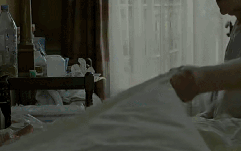 电影里,哈内克拍了好几个外人赞扬丈夫“不离不弃”的情节。