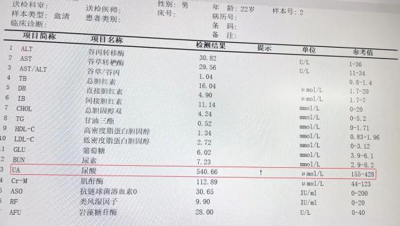 2017年8月,18岁的他进入到广东肇庆一家医院的检验科实习,当时科主任提出帮他们这批实习生做体检。体检结果出来,尿酸一栏赫然显示:560μmol/L(μmol /L是浓度单位,即微摩尔/升,指1升液体中所含某种物质的量),比正常值足足高出140μmol/L。这个结果等同于宣告他患上了高尿酸血症(HUA),也就是我们平时俗称的尿酸高。