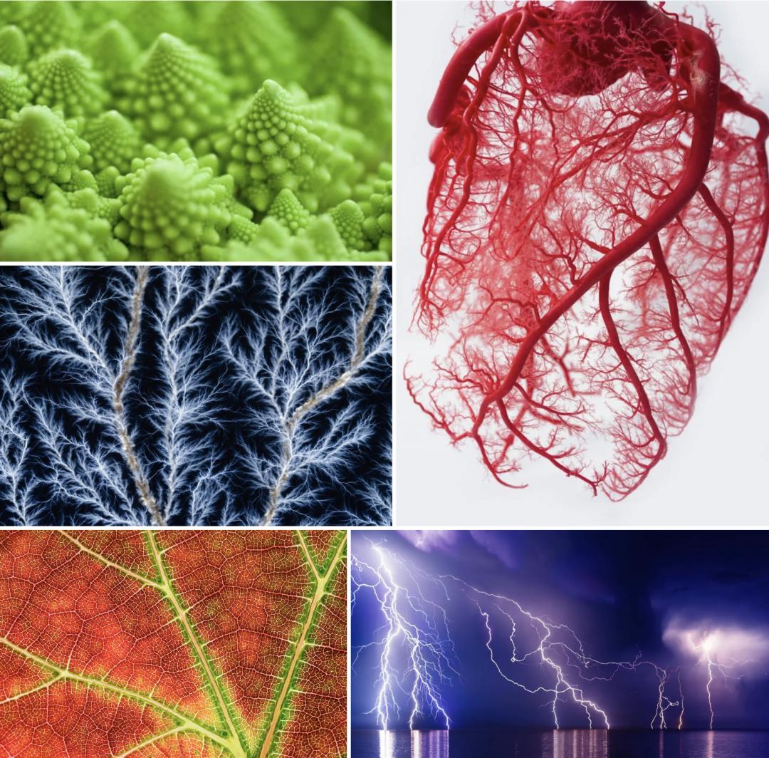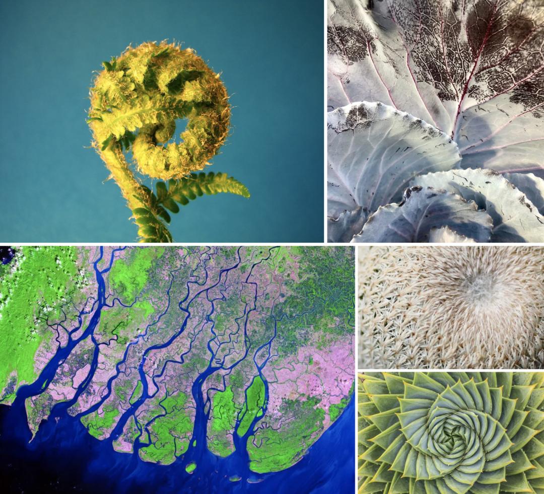花朵、蕨类植物、树叶、河道、闪电、雪花是自然界分形的一些例子。Romanesco Broccoli 是花椰菜的变种,是一种极具分形的蔬菜。它的斑图是斐波那契数列或黄金螺旋的自然表示,这是一种对数螺旋,每四分之一转距离原点的距离都是黄金比例的一个因数。