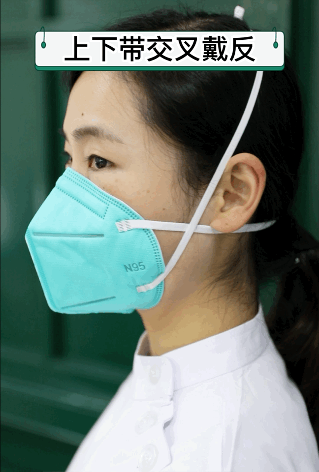 将口罩覆盖面部,使鼻夹结构在上面。固定头带或耳带。按压金属条使之紧贴鼻梁,使口罩与面部紧密贴合,口罩要遮盖鼻、口和下颌。