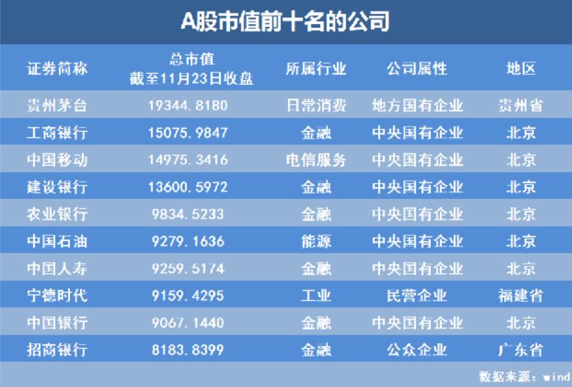 红星资本局梳理了A股市场总市值排名前十的上市企业。截至11月23日收盘,按照从高到低排序,依次是贵州茅台(600519.SH)、工商银行(601398.SH)、中国移动(600941.SH)、建设银行(601939.SH)、农业银行(601288.SH)、中国石油(601857.SH)、中国人寿(601628.SH)、宁德时代(300750.SZ)、中国银行(601988.SH)以及招商银行(600036.SH)。