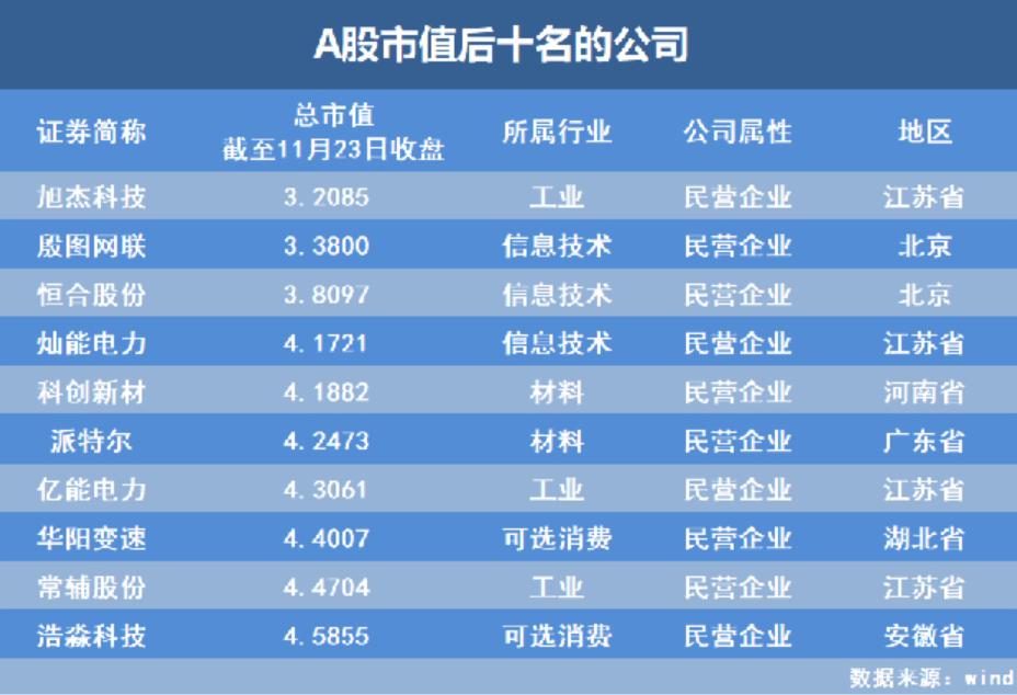 截至11月23日收盘,据Wind数据,A股市场总市值排名倒数的10家企业,从低到高排,依次为旭杰科技(836149.BJ)、殷图网联(835508.BJ)、恒合股份(832145.BJ)、灿能电力(870299.BJ)、科创新材(833580.BJ)、派特尔(836871.BJ)、亿能电力(837046.BJ)、华阳变速(839946.BJ)、常辅股份(871396.BJ)、浩淼科技(831856.BJ)。