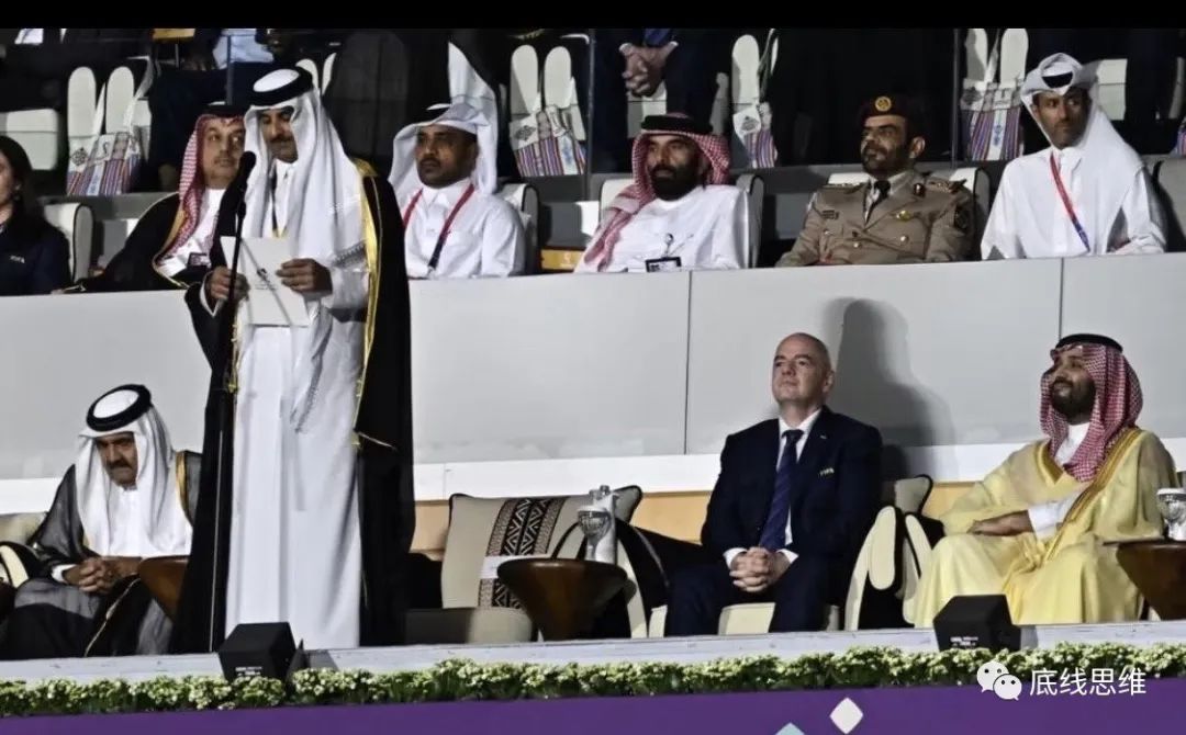 卡塔尔国王(左二)在开幕式上发表讲话,因凡蒂诺(右二)和萨勒曼(右一)并肩而坐