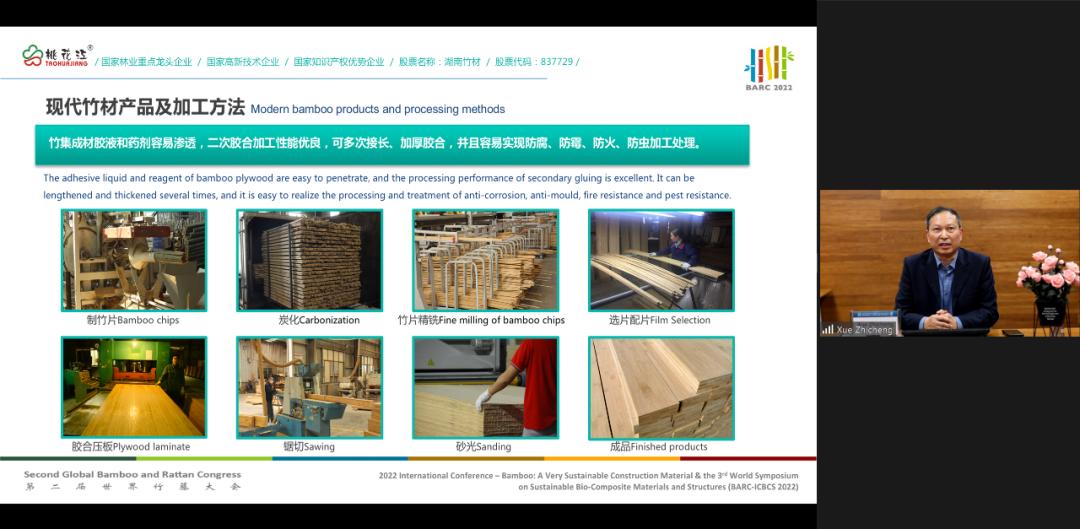 △ 王军龙演讲薛志成的演讲主题是“现代竹建筑结构材研发与应用”。他首先对比了不同种类现代工程竹产品的加工方式及其应用场景,包括竹木胶合板、竹刨花板、重组竹和竹集成材。之后,他系统展示了湖南桃花江竹材科技股份有限公司(简称:湖南桃花江)在竹建筑结构材方向的研究,其重点研发的结构用竹集成材产品在强度、耐久性、任意尺寸加工工艺和防火性能等方面表现突出。湖南桃花江所研发的无限接长和大幅面成形技术,现可一次成型十米长大幅面板材,胶合强度高。其计划利用自主研发生产的结构用竹集成材建造一栋三层办公楼,预计今年年底完成主体结构建造。最后,薛志成从生产企业角度提出了中国竹建筑产业复合型人才缺失问题。目前,中国竹建筑领域缺少既熟悉竹材特性和加工技术又了解竹材设计应用的专家,使得竹建筑结构材在应用推广过程中遇到问题无法快速妥善解决。他呼吁未来能有更多设计领域专家加入竹材特性和加工技术研究中,共同促进中国现代竹建筑的发展。