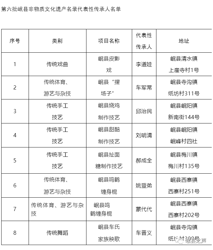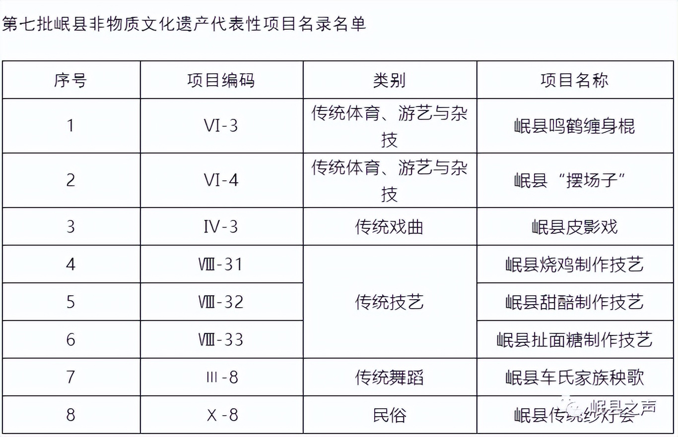 为进一步作好我县非物质文化遗产保护和传承工作,根据《中华人民共和国非物质文化遗产法》《甘肃省非物质文化遗产保护条例》。近日,经县文体广电和旅游局非遗中心调查推荐,现新增岷县鸣鹤缠身棍、岷县传统纱灯会、岷县皮影戏、岷县“摆场子”、岷县车氏家族秧歌、岷县烧鸡制作技艺、岷县甜醅制作技艺、岷县扯面糖制作技艺等8个项目为岷县第七批非物质文化遗产代表性项目名录。新增李道娃、车军常等8人为第六批岷县非物质文化遗产名录代表性传承人,现将推荐名单予以公布。