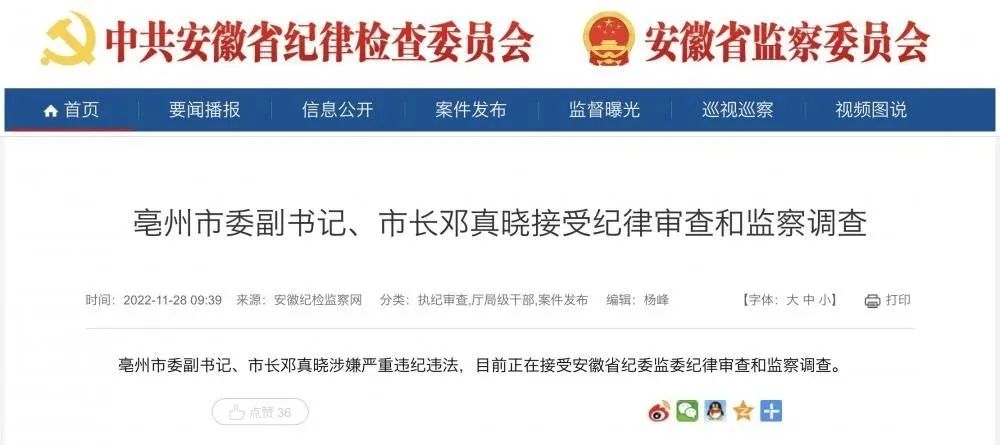 11月28日,安徽省纪委监委发布消息,亳州市委副书记、市长邓真晓涉嫌严重违纪违法,目前正在接受安徽省纪委监委纪律审查和监察调查。