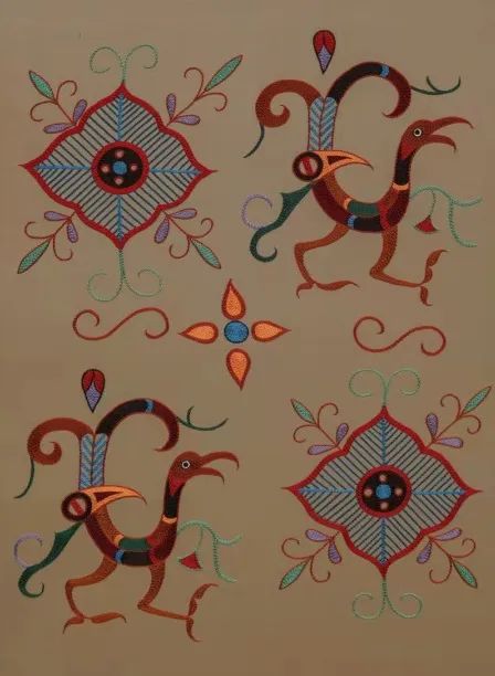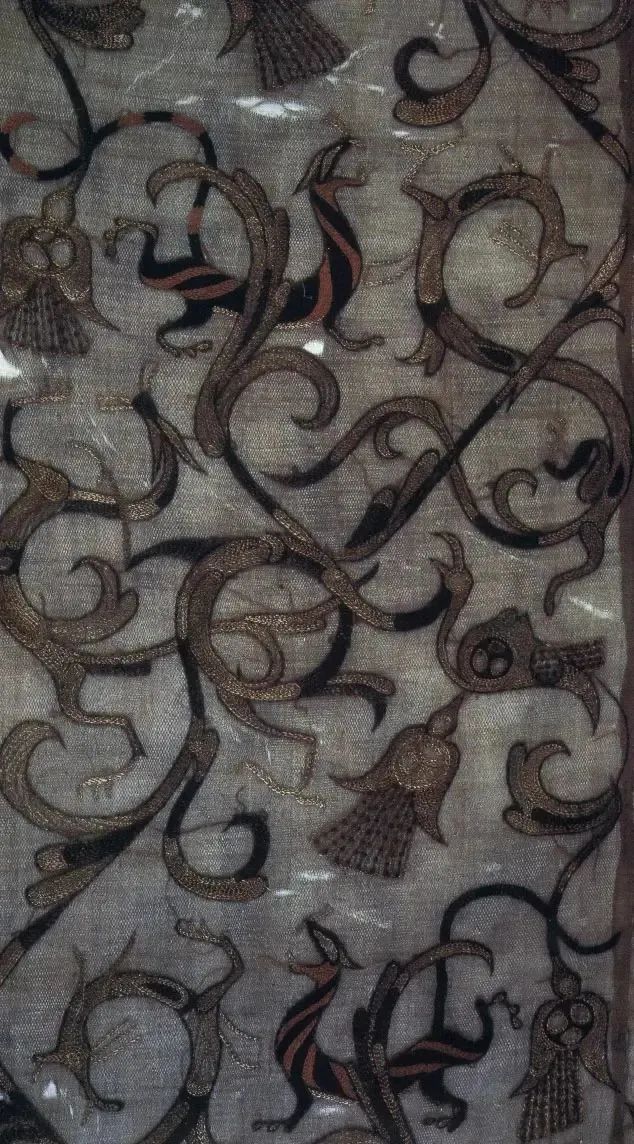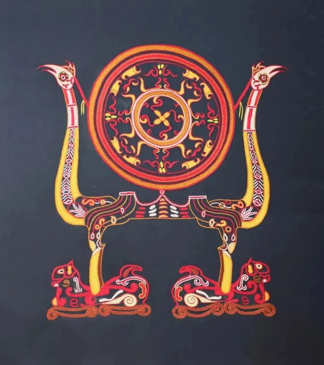 “翡翠珠被,烂齐光些。”这句出自屈原的《楚辞招魂》描绘了当时楚绣的盛况,绣工如同美工绘画一般,勾勒点染,敷色涂抹,灵意飞动,楚绣具有色彩艳丽、构图简洁、意蕴空灵、富于装饰性的特点。搭配得当
