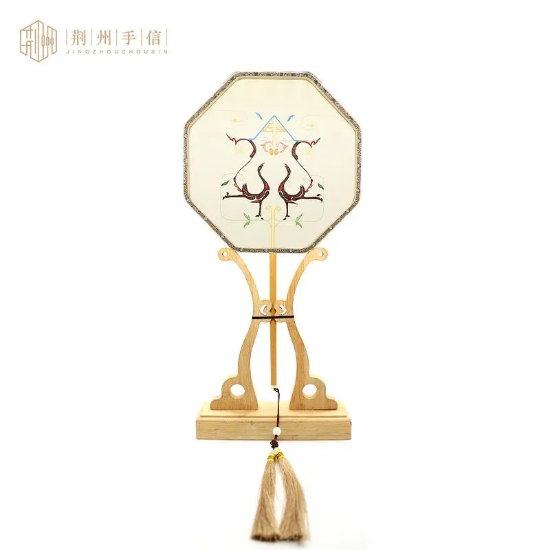 例如:卷轴挂画、楚绣摆件、扇子、包包、书签、茶旗、杯垫、镜子、耳钉等。下面,我们来欣赏一波荆州手信文创店内所展陈的楚绣作品吧!