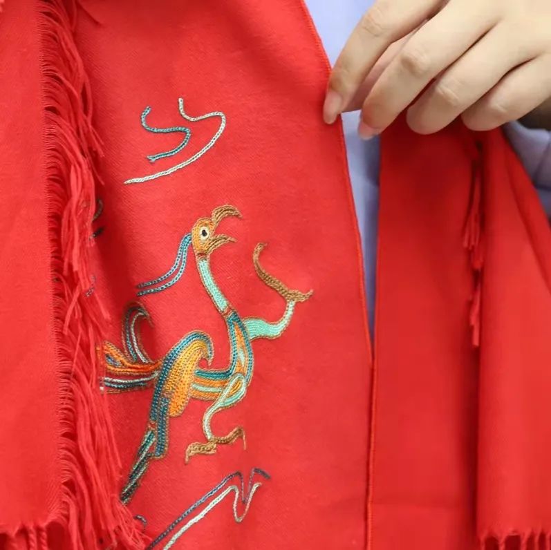作者:非遗传承者李桥来楚绣凤鸟羊毛披肩