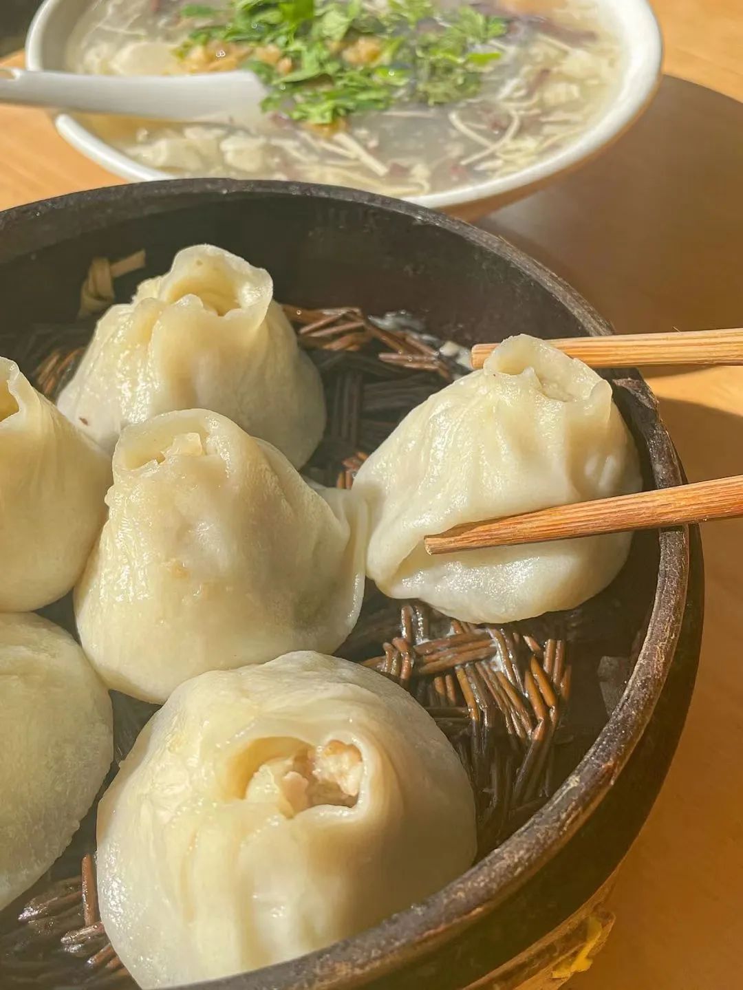 小红书@天使爱跳迪斯科常州的小笼包顶头会留一个孔,盲猜方便你浇入醋汁。20元一份的蟹粉小笼,吃不满足,还可以再来一份豆腐汤。
