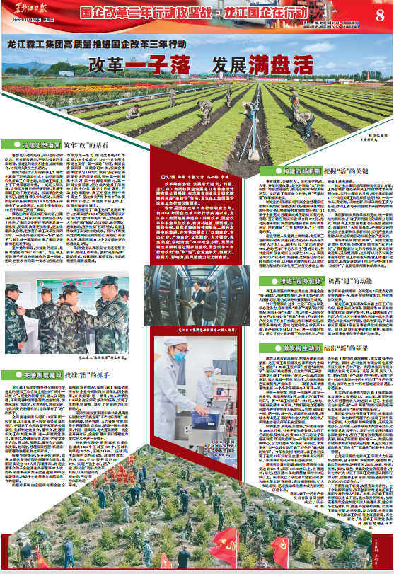 今年是国企改革三年行动收官之年。自2020年国企改革三年行动实施以来,龙江森工集团统筹推进森工体制改革、国企改革和事业单位改革,着力补短板、强弱项,以猛药去疴、自我革命的精神破解森工振兴发展中的难题,开创性地提出了“政治建企、生态立企、产业富企、文化润企、人才强企、民生筑企、法纪治企”28字建企方针,集团体制改革顺利通过国家级验收,国企改革三年行动改出“稳”和“进”,企业竞争力、创新力、控制力、影响力、抗风险能力跃上新台阶。