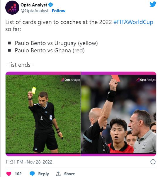 算上第一轮对阵乌拉圭时吃到的黄牌,本托“领跑”本届世界杯主教练红黄牌榜。