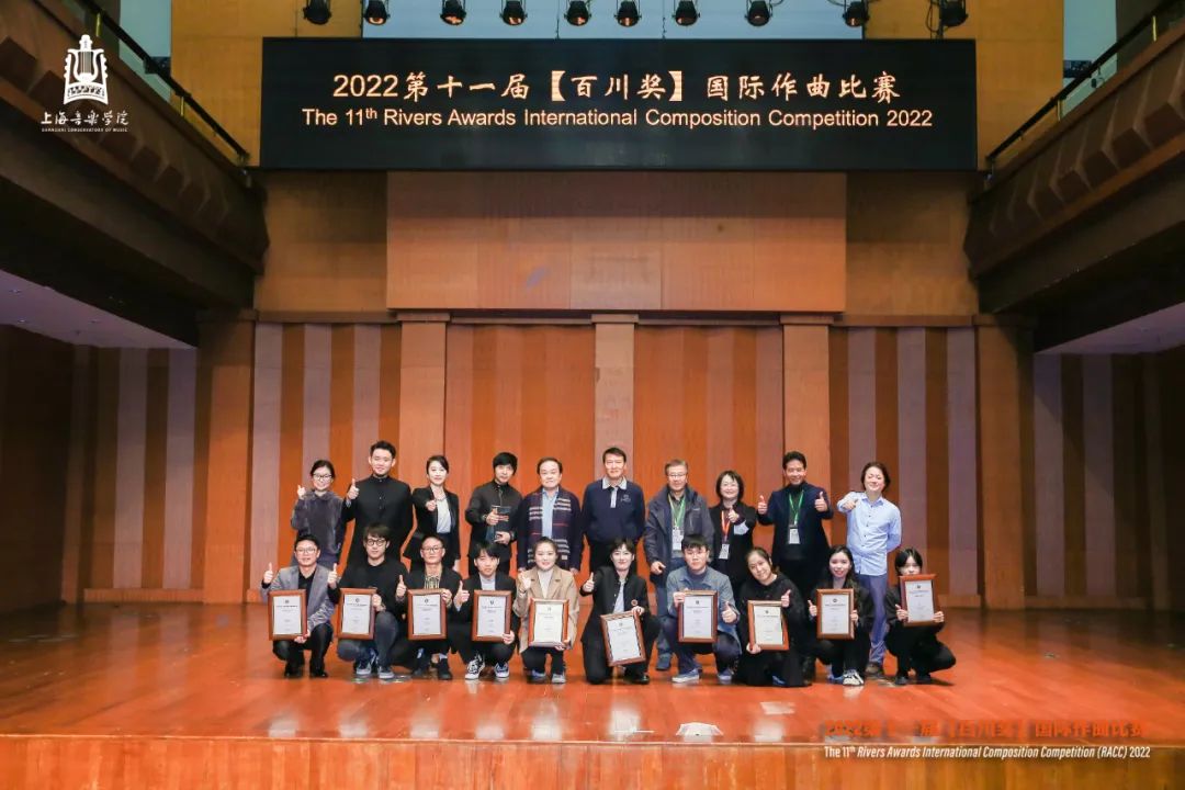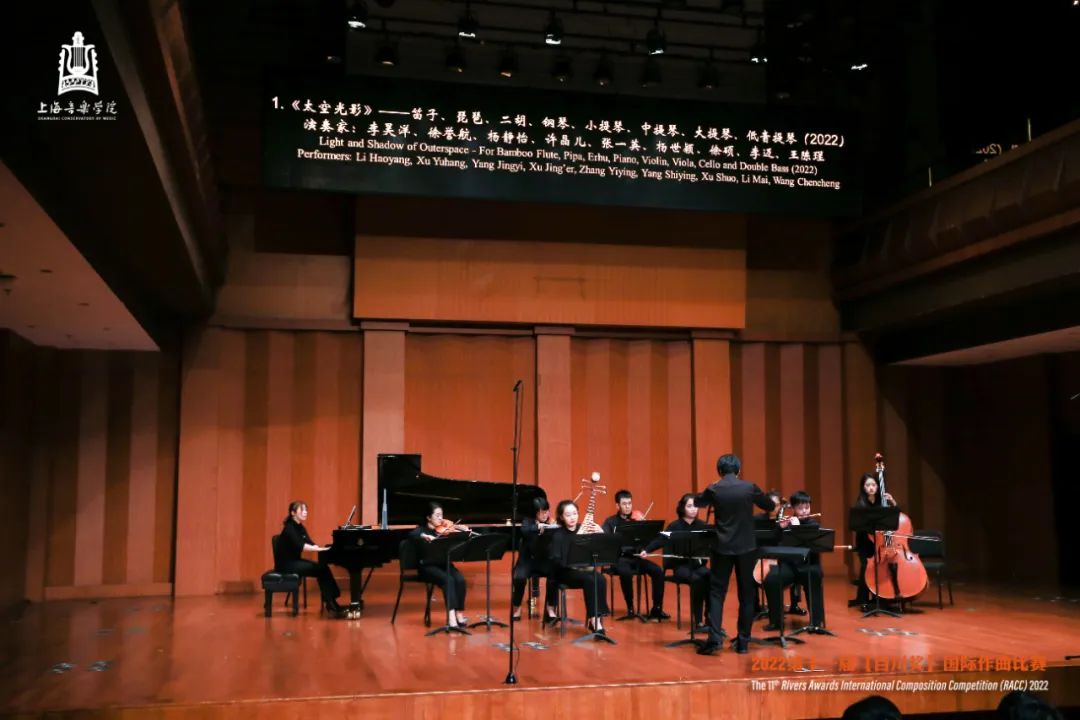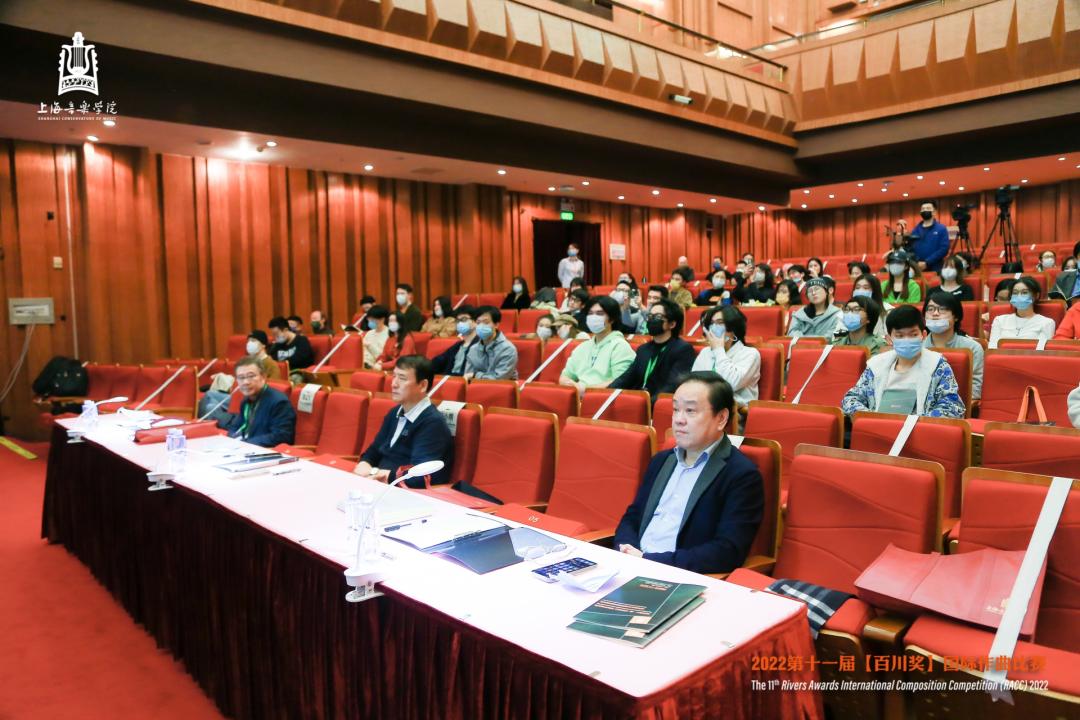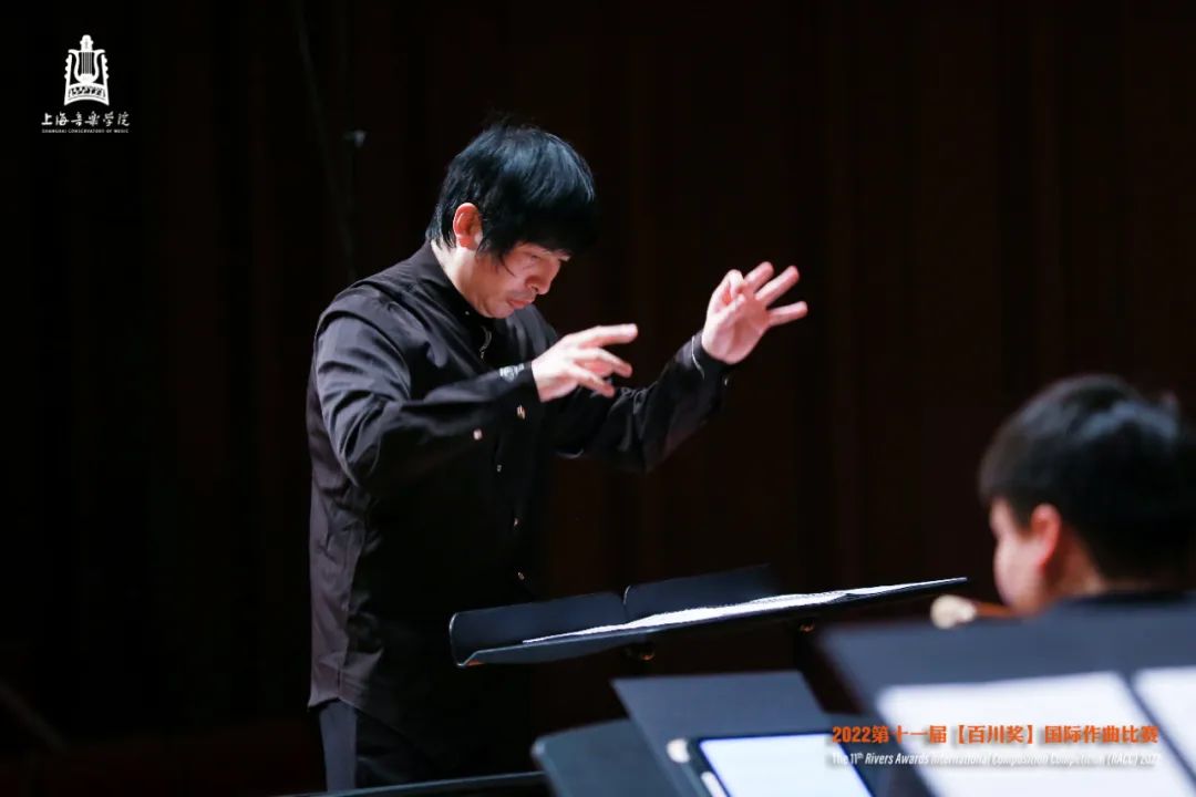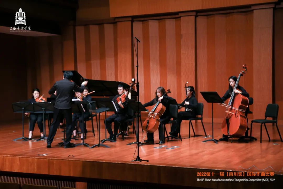 当晚,2022年第十一届“百川奖”国际作曲比赛决赛暨颁奖音乐会在上海音乐学院贺绿汀音乐厅顺利举行。本场比赛在上音作曲与作曲技术理论专业虚拟教研室平台同步进行直播。今年的决赛音乐会,由指挥家高健带领上海大地之歌室内交响乐团和上音师生共同演绎。评选全程公平公正,严格采取导师回避制度。初评评委10位,决赛评委包括:评委会主席、上海市艺术界联合会副主席、上海音乐学院作曲指挥系许舒亚教授,中国文学艺术界联合会副主席、中国音乐家协会主席叶小纲教授,中国音协作曲与作曲理论学会副会长、上海音乐学院作曲指挥系徐孟东教授、武汉音乐学院作曲系主任赵曦教授,以及国际现代音乐协会主席格伦达·基姆(新西兰)、法国频谱派创始人之一特里斯坦·米哈伊(法国)、马格努斯·林德伯格(芬兰)、维拉达米·塔诺波斯基(俄罗斯)、彼得·斯文南(比利时)五位通过“云端”在线完成作品评审的国外作曲家。