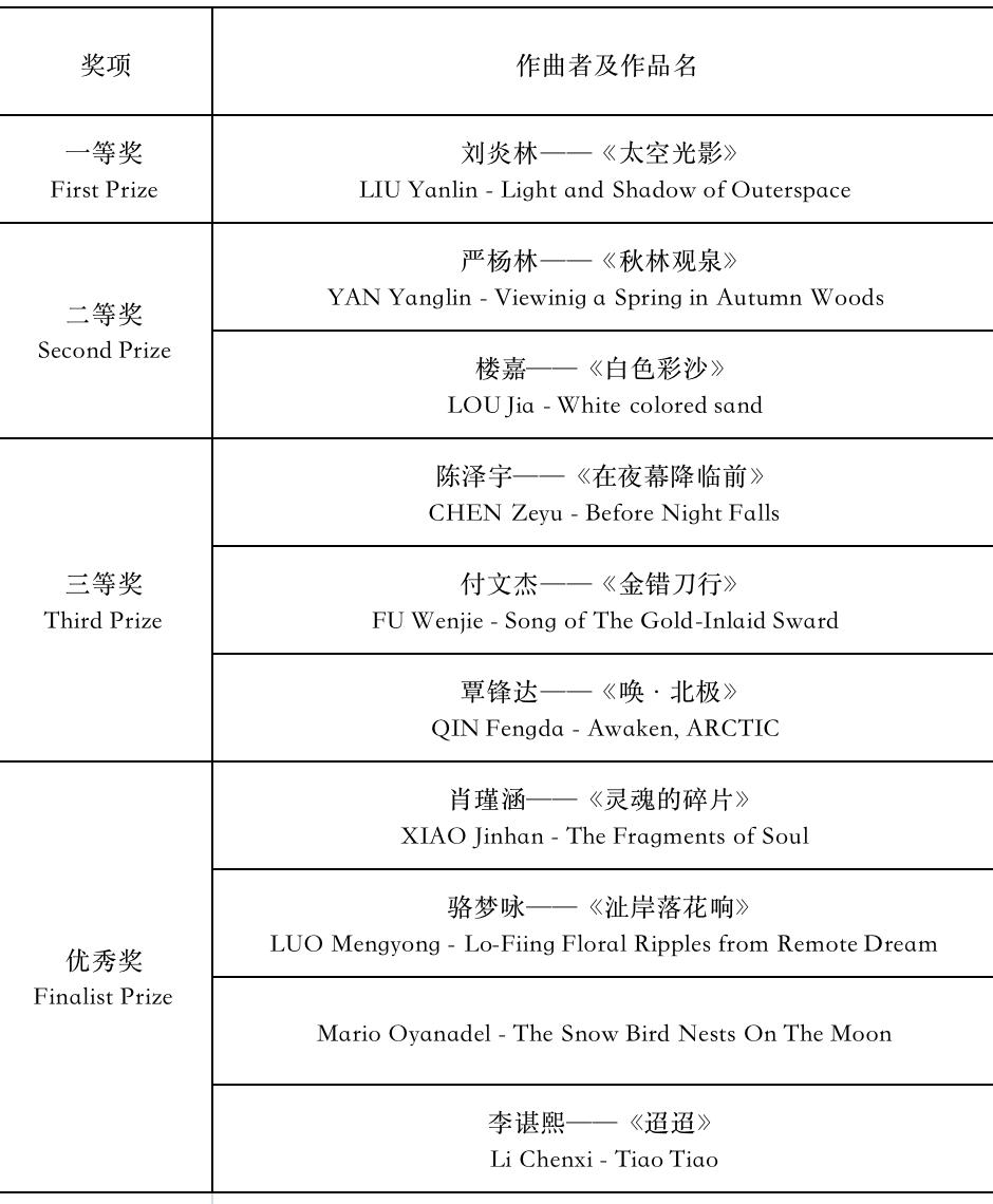 今年入围决赛的十部作品,采用海内外评委通过线上线下共同打分的形式,最终,上海音乐学院在读博士研究生刘炎林的《太空光影》荣获一等奖;安徽师范大学音乐学院在读硕士研究生严杨林的《秋林观泉》、上海音乐学院硕士研究生楼嘉的《白色彩沙》荣获二等奖;上海音乐学院在读博士研究生陈泽宇的《在夜幕降临前》、中央音乐学院在读硕士研究生付文杰的《金错刀行》、广西艺术学院青年教师覃锋达的《唤·北极》荣获三等奖;上海音乐学院本科生肖瑾涵的《灵魂的碎片》、上海音乐学院在读博士研究生骆梦咏的《沚岸落花响》、智利青年作曲家 Mario Oyanadel 的 《The Snow Bird Nests On The Moon》、上海音乐学院在读博士研究生李谌熙的《迢迢》荣获优秀奖。