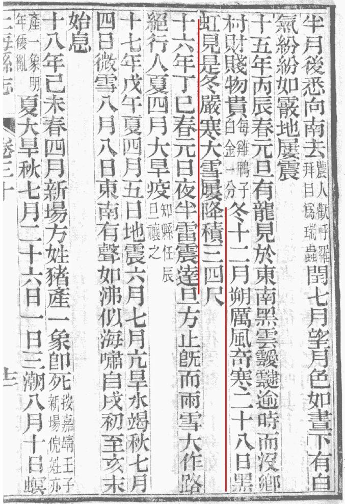 《同治上海县志》卷三十记载“顺治十五年冬十二月,朔厉风奇寒,二十八日黑虹见,是冬严寒大雪屡降,积三四尺。”
