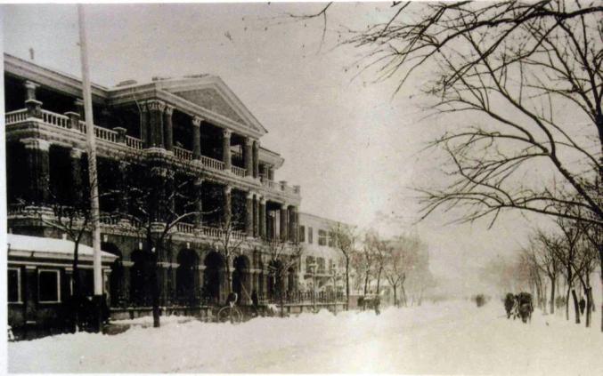 1862年上海大雪。拍摄地点现今延安东路中山东路口。背景中这栋三层建筑就是第一代上海总会,也就是现今中山东路2号的前身图片来源 | virtual shanghai