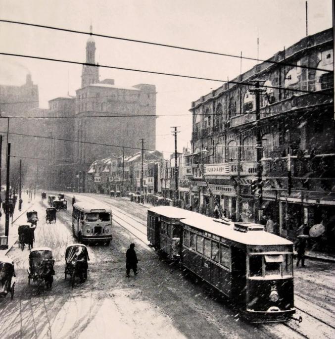1957年上海大雪,一辆有轨电车驶过西藏路南京路口1977年1月31日,雪后奇寒,市区(龙华站)最低气温为-10.1℃,上海县为-11.0℃,是1949年后之最低记录。