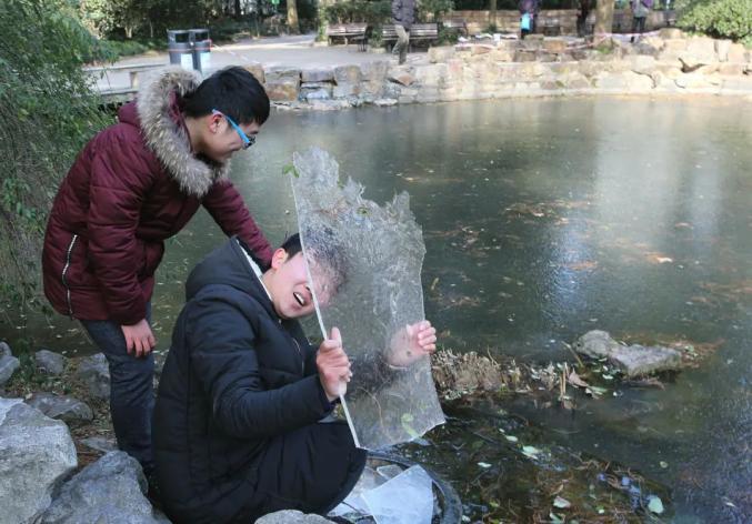 2016年1月24日,两位市民在人民公园内好奇地打量池塘中的冰层图片摄影 | 张锁庆