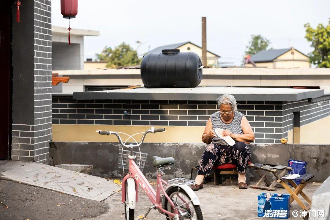 2022年6月28日,76岁的王大娘在家门口边纳凉边纳鞋底。