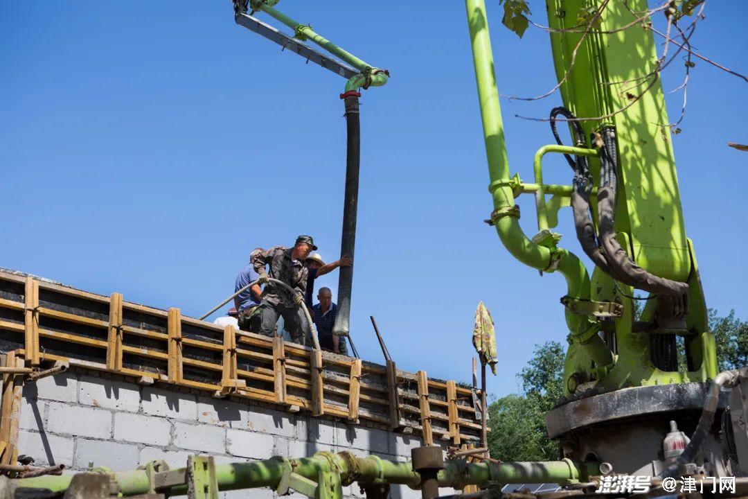 2022年6月1日,打麦场南侧,一户村民正在用水泥灌车浇注新房顶。