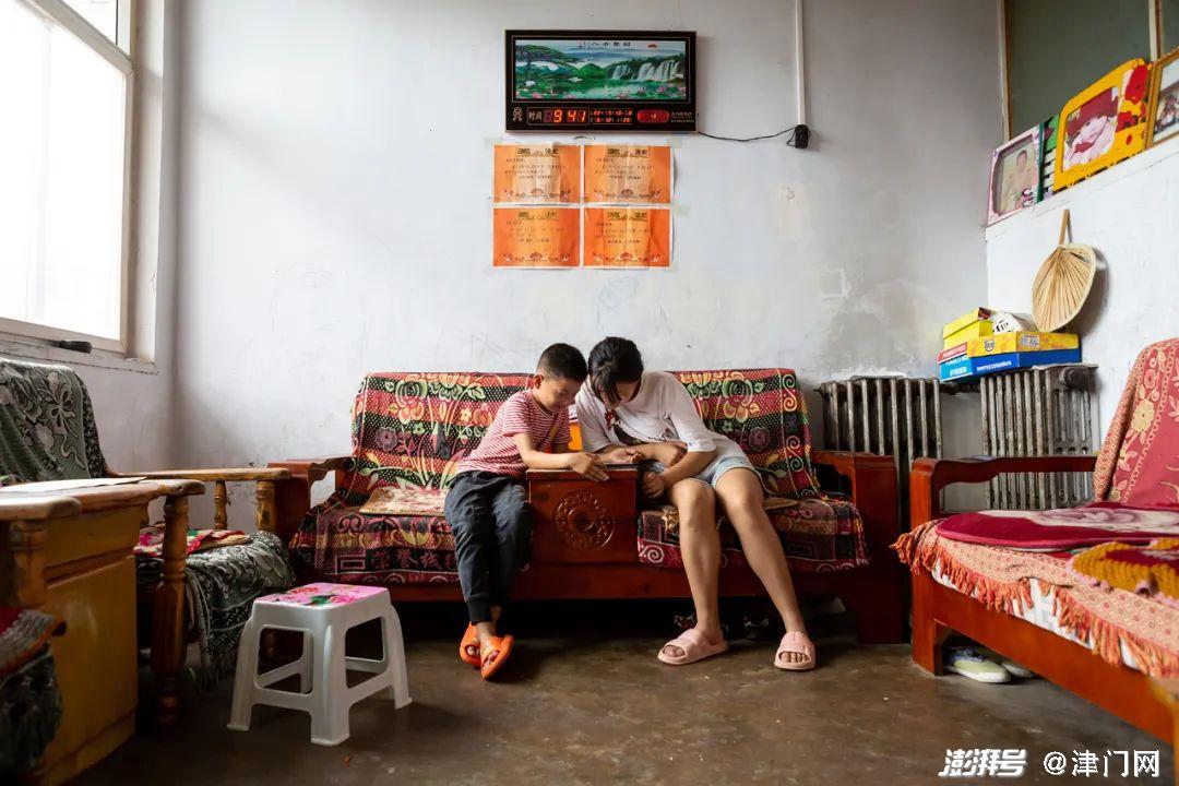 2022年7月10日,一户村民上小学的女儿、儿子在家里玩儿ipad。