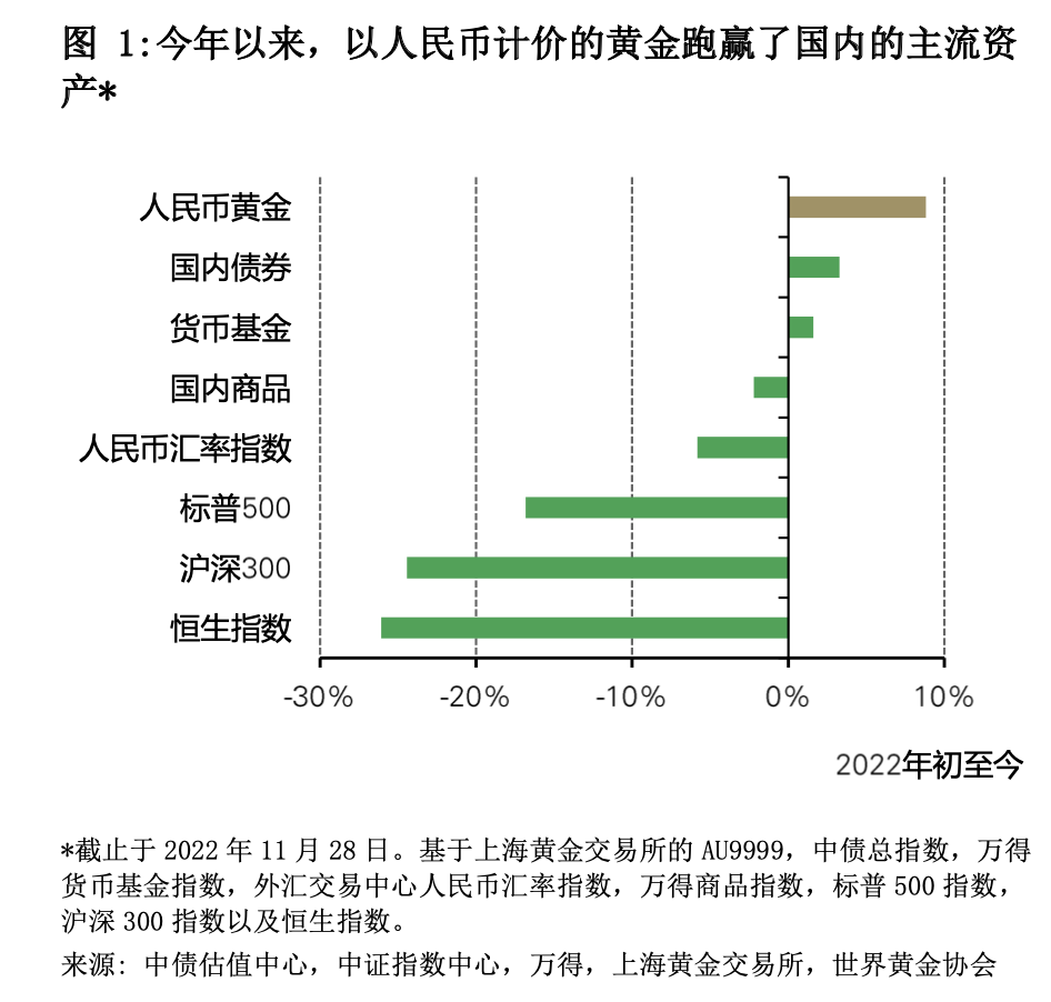 报告显示,今年以来,以人民币计价的黄金价格上涨了9%,超越了国内债券、货币基金、国内商品等国内主流资产。