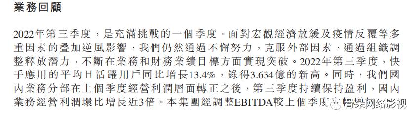 此外,B站曾因高度依赖游戏业务而被市场观望。截至今年三季度,公司游戏业务的占比已从2018年的约七成降至四成,其营收结构肉眼可见的在不断优化。而B站对2022年第四季度的展望是,预计收入将达到60亿元至62亿元。快手小伙:海外业务有望盈利