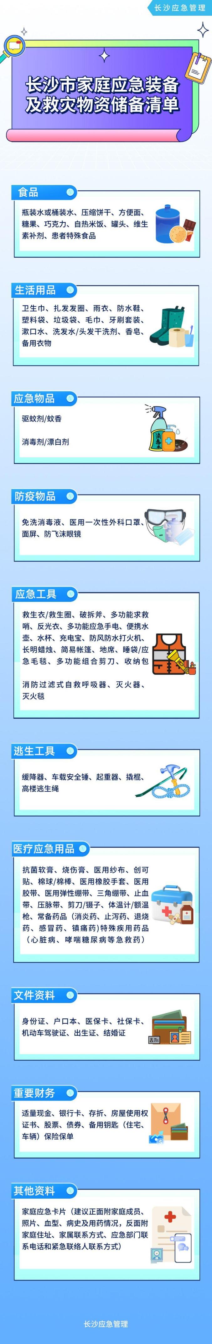 近日,长沙市应急局、市发改委、市科技局、市工信局、市公安局、市民政局、市财政局、市住建局、市城管执法局、市交通局、市商务局、市物流口岸办、市卫健委13部门联合发布《关于加强应急物资保障体系建设的意见(试行)》(以下简称《意见》)。《意见》指出,县级以上政府结合本地实际,提出家庭必备应急物资名录,鼓励和引导居民储备必要的家庭应急物资。